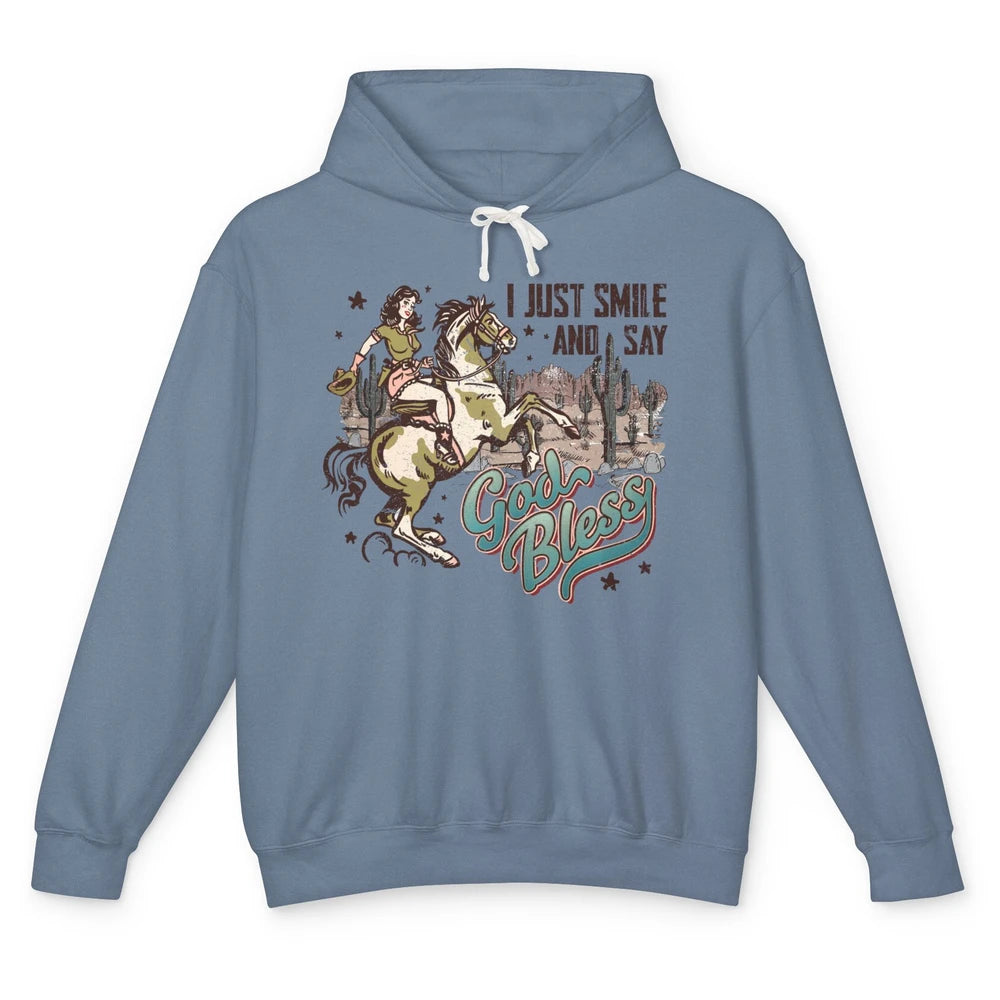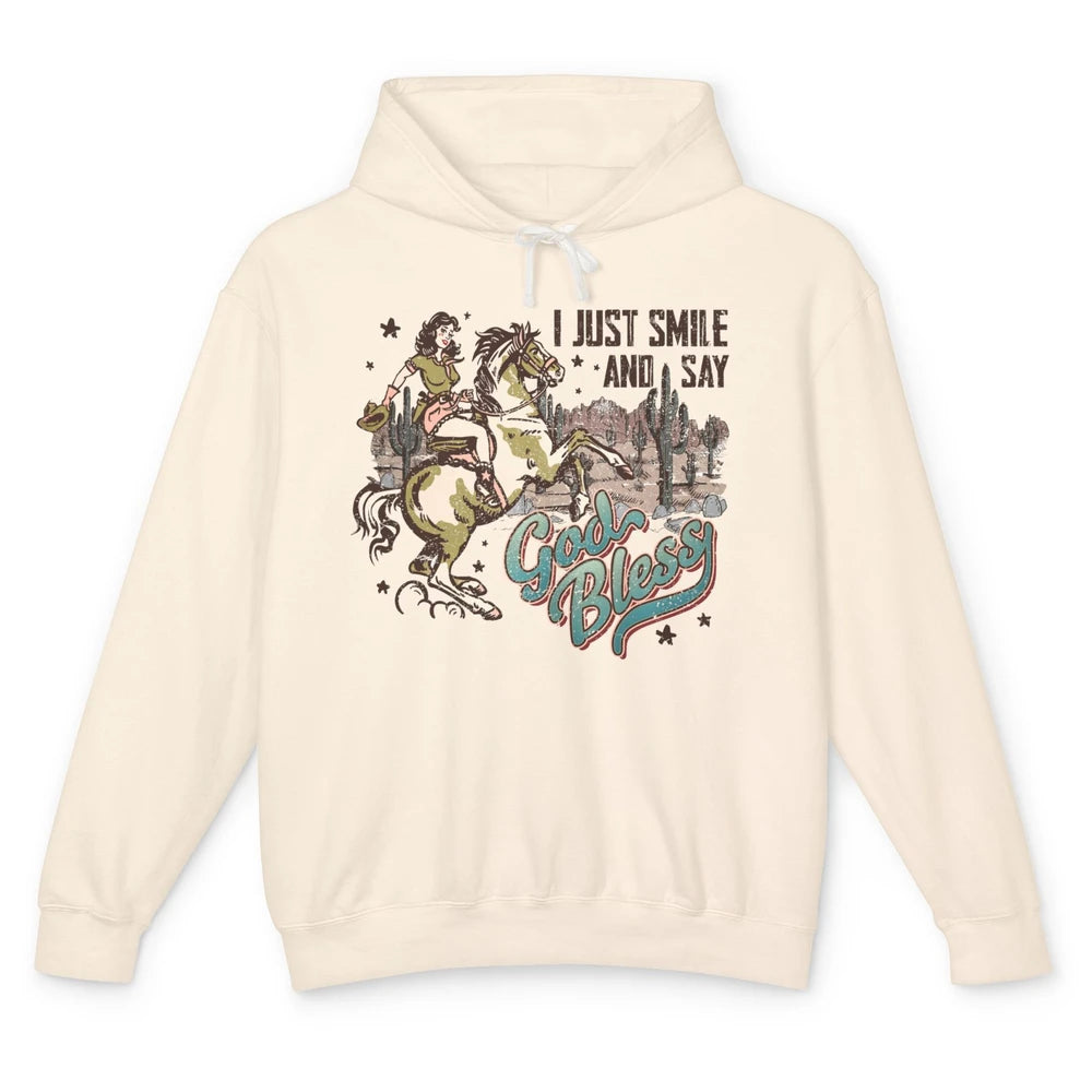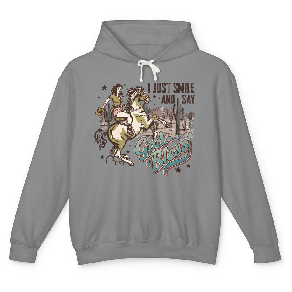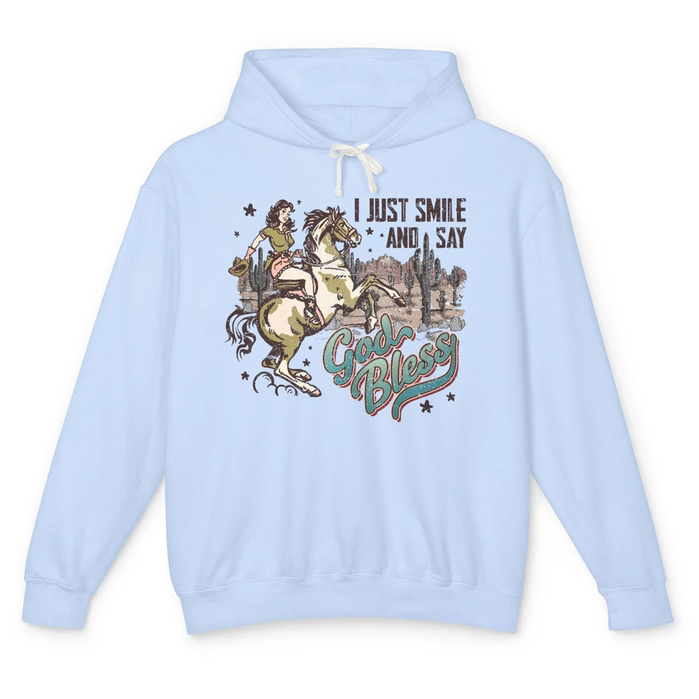 Retro Cowgirl Horsing I Just Smile And Say God Bless Western Unisex Lightweight Hoodie